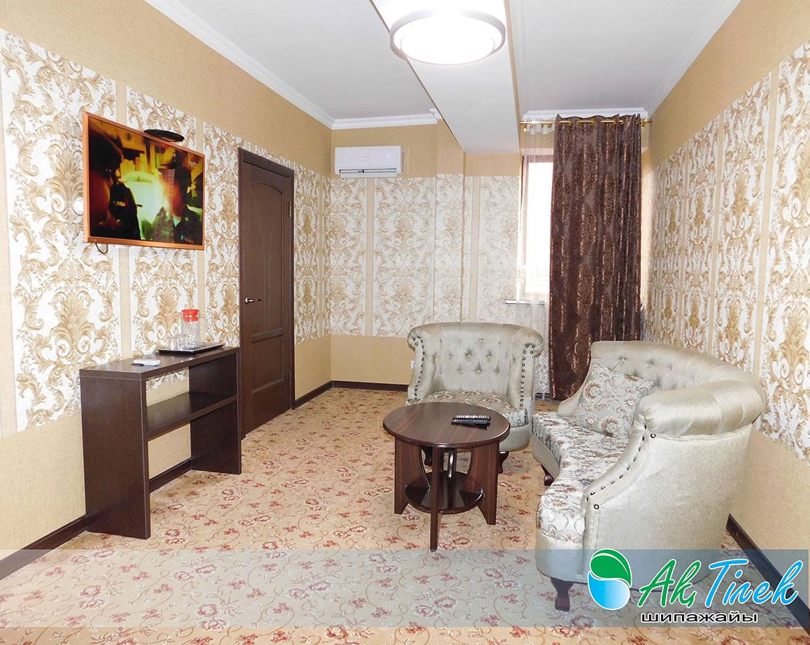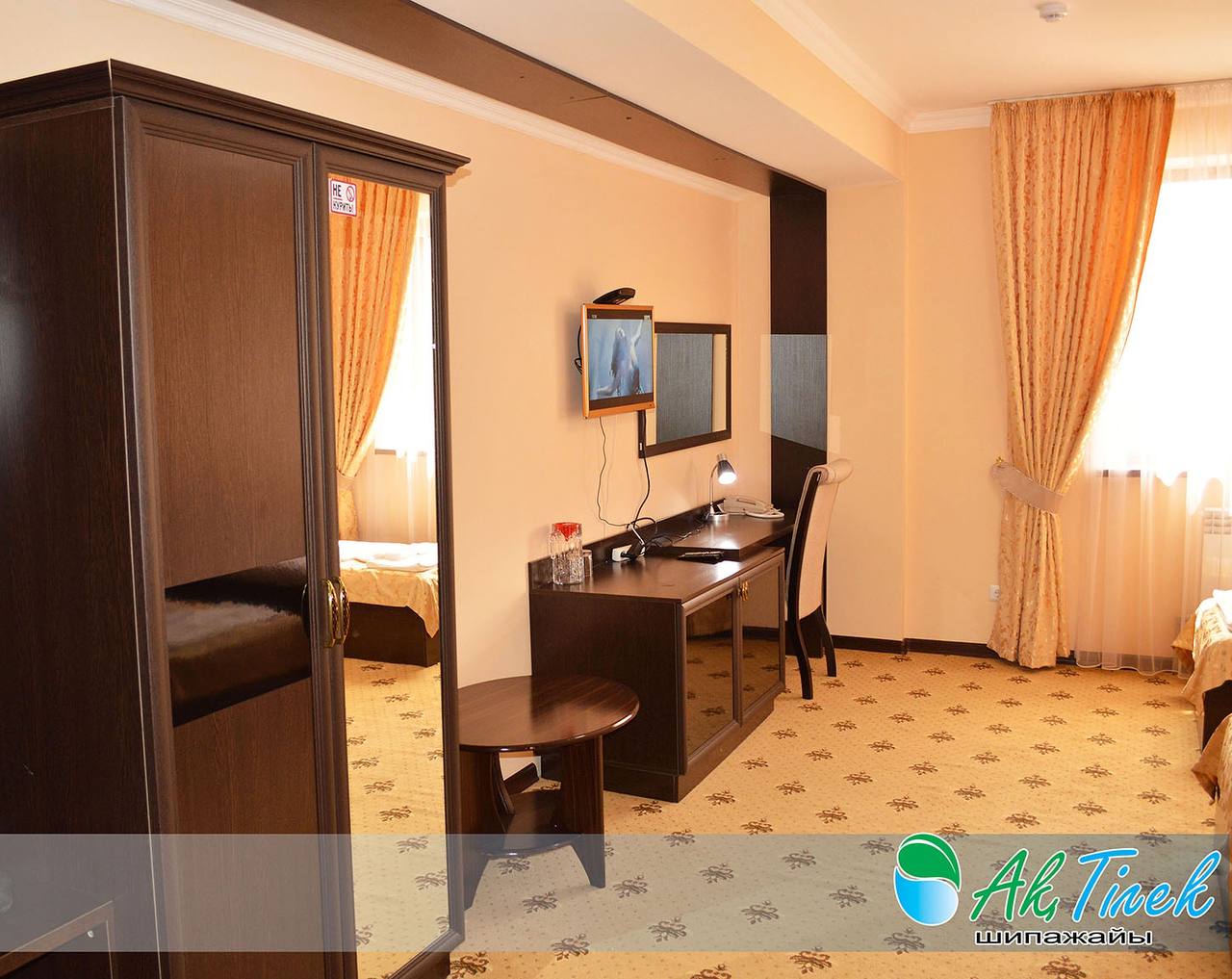 | Полу-люкс | 1 место с подселением (кровать 2000×900 мм) | Кондиционер, телевизор, кабельное ТВ, холодильник, сейф, санузел, душевая кабина, фен, Wi-Fi — бесплатно | 24 000 тг |